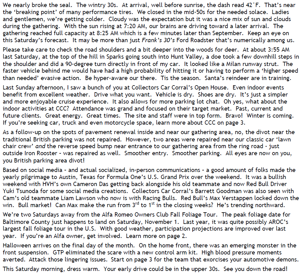 Breaking the 40s to 30s Seal, Deer Safety, CCC Open House, Gathering Construction, Bull Market at US GP, Alfa Tour Nov 1, Avoid High BP Halloween