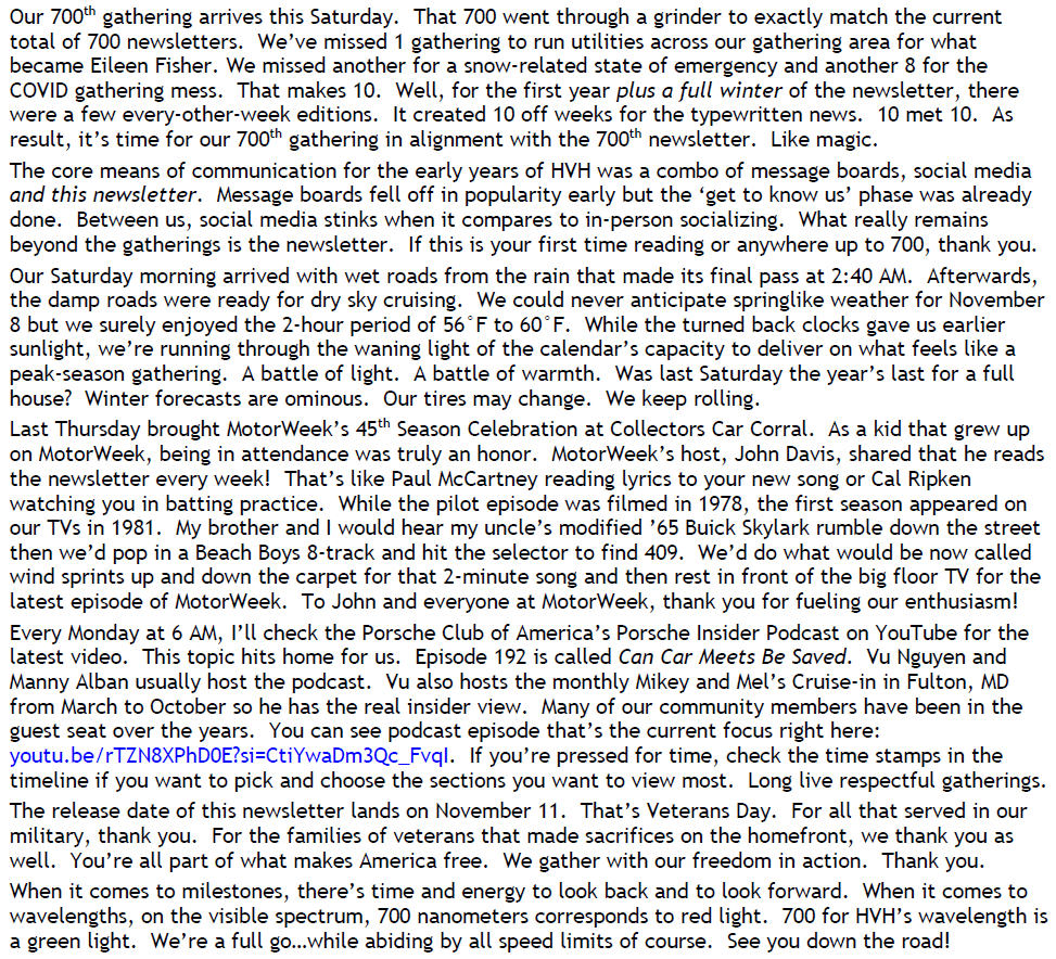 700th Saturday, 700th Newsletter, Socializing > Social Media, Balmy November, MotorWeek 45th, Hi John Davis, Save Car Meets, Veterans Day, 700 Nanometers Richard WilliamsNovember 11, 2025Hunt Valley Horsepower, 700, MotorWeek, Collectors Car Corral, Porsche Insider Podcast, Porsche Club of America, Veterans Day, 700 nanometers Facebook0
