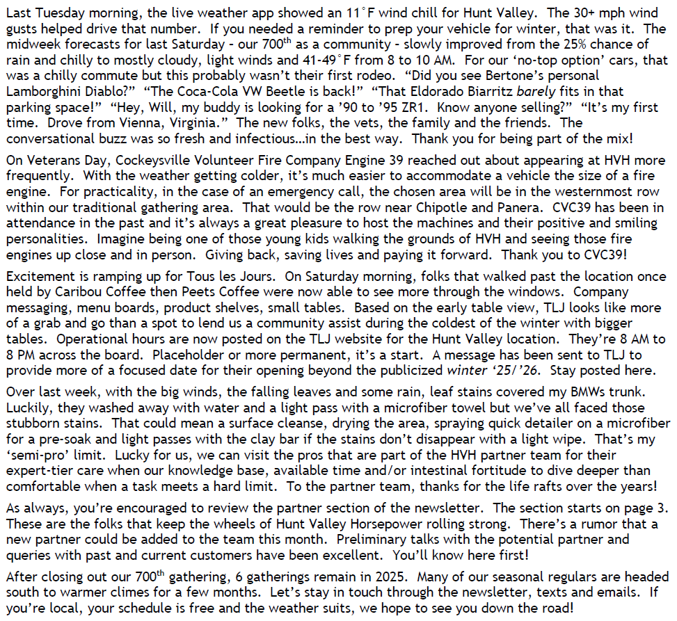 11F Wind Chills, 700 in the Rear View, Bertone Diablo, Big Biarritz, Our Local Fire Company, Tous les Jours Soon, Removing Leafy Paint Stains, New Partner Soon?, Stay In Touch Richard WilliamsNovember 17, 2025Hunt Valley Horsepower, Bertone, Eldorado Biarritz, ZR1, CVFC39, Cockeysville Volunteer Fire Company, Tous les Jours, Detailers, Paint stains Facebook0