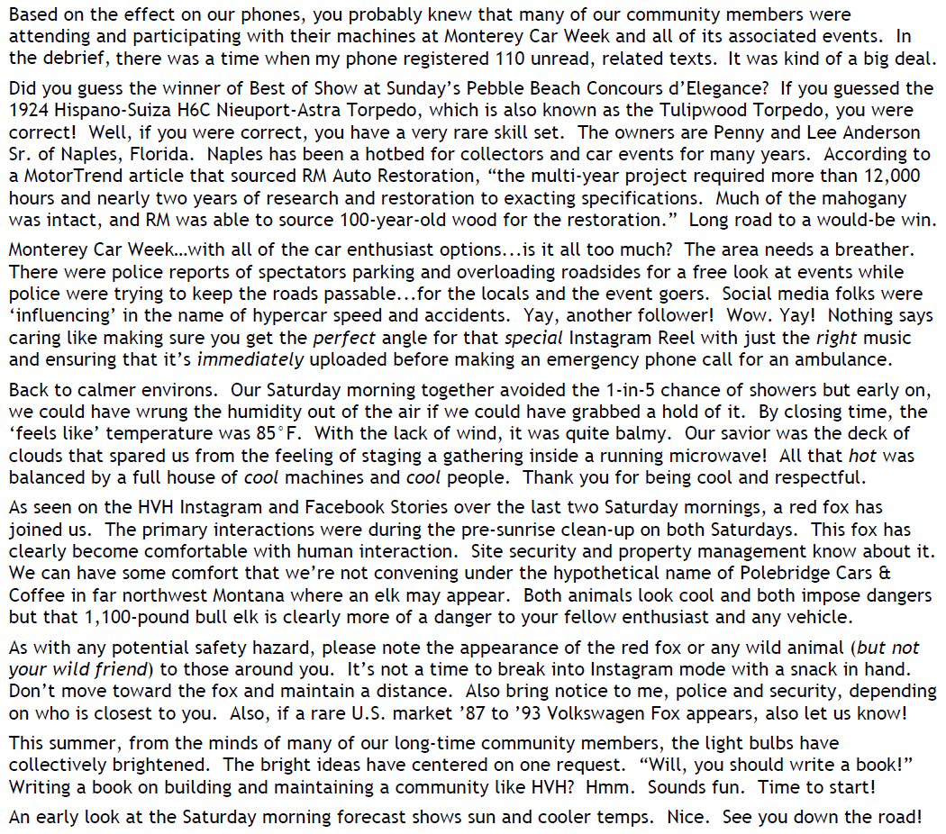 Monterey Car Week, Pebble, Hispano-Suiza, Tight Parking, Social Fumbles, Hot Cold Saturday, Fox vs Elk, VW Fox, Throw The Book At Him Richard WilliamsAugust 19, 2025Hunt Valley Horsepower, Pebble Beach Concours, Monterey Car Week, Hispano-Suiza, Tulipwood Torpedo, Polebridge, Polebridge Montana, Hunt Valley Horsepower book, RM Auto Restoration Facebook0