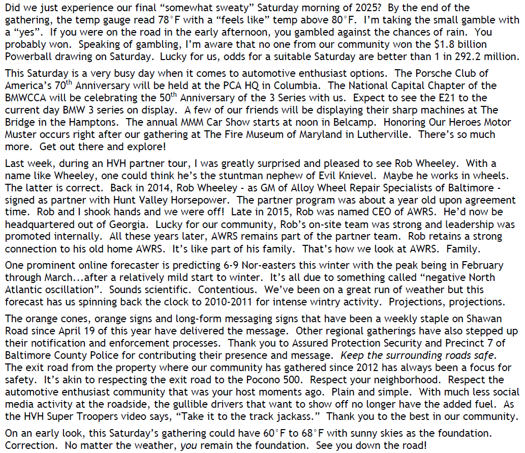 Gambling with Sweat, PCA 70th, BMW 3 Series 50th, Wheeley Meeting, Seeing the CEO, AWRS Family, Early 26 Snow, Cones Signs and Messages Winning