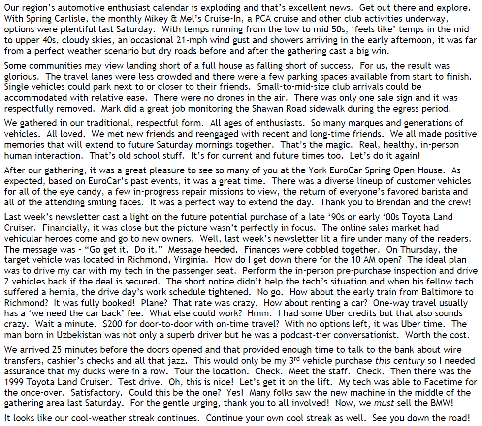 Event Calendar Explodes, Under Capacity Joys, York EuroCar Spring Open House, Cruiser Cruise To Richmond, Shakedown and Buy, Thank You For The Pressure Richard WilliamsApril 29, 2026Hunt Valley Horsepower, Spring Carlisle, MIkey and Mel's Cruise-In, PCA Chesapeake, York EuroCar, York EuroCar Open House, Hunt Vally EuroCar, Toyota Land Cruiser, Richmond Virginia, Uber Facebook0